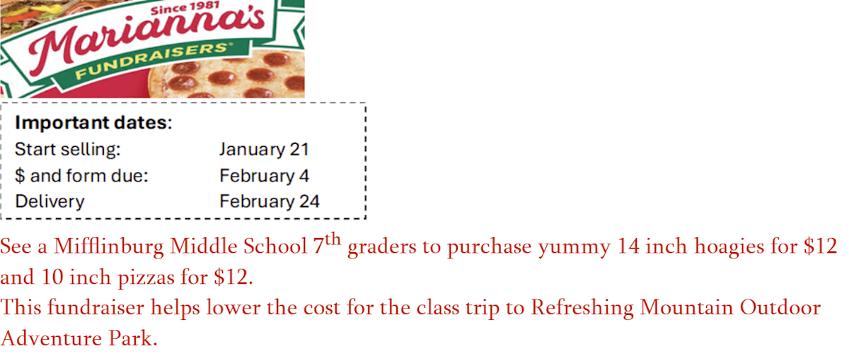 Mifflinburg Middle School seventh graders launched a food fundraiser to reduce the out-of-pocket cost for their planned class trip to Refreshing Mountain Outdoor Adventure Park. The district announced the campaign on January 16, and sales began January 21, offering 14-inch hoagies for $12 and 10-inch pizzas for $12. Order forms and payment are due February 4, with delivery scheduled for February 24.